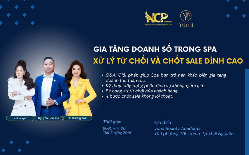 NCP Group vô cùng vinh dự thông báo về sự kiện đặc biệt "Gia Tăng Doanh Số trong Spa - Xử Lý Từ Chối và Chốt Sale Đỉnh Cao" sẽ diễn ra từ 8h00 đến 17h00 vào ngày 20/6 tại Yumi Beauty Academy, tổ 1, phường Tân Thịnh, Thành phố Thái Nguyên.